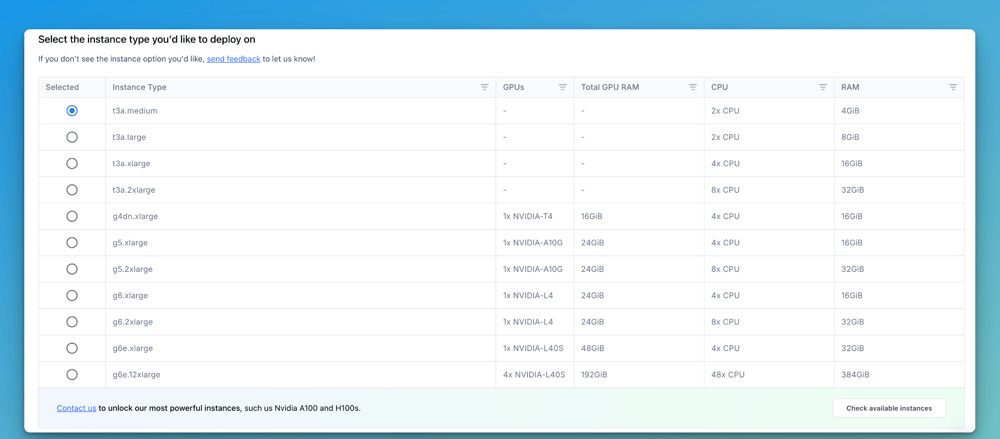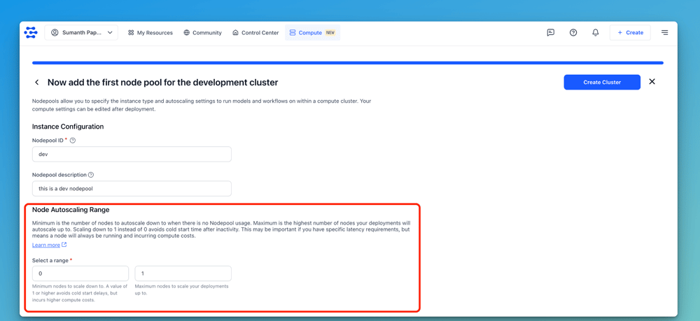 Once you set up the Node Autoscaling Range, select the instance type where you want your workloads to run, and create the Nodepool. You can find more information about the available instance types for both AWS and GCP here.