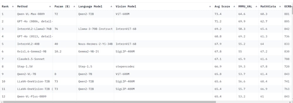 Recent rankings indicate that Qwen-VL-Max-0809 has outperformed GPT-4o in terms of average benchmark scores. This is significant because GPT-4o was previously considered the top multimodal model. The rise of large open-source models like Qwen2-VL-7B suggests that open-source models are beginning to surpass their closed-source counterparts, including GPT-4o. Notably, Qwen2-VL-7B, despite its smaller size, achieves results that are close to those of commercial models.