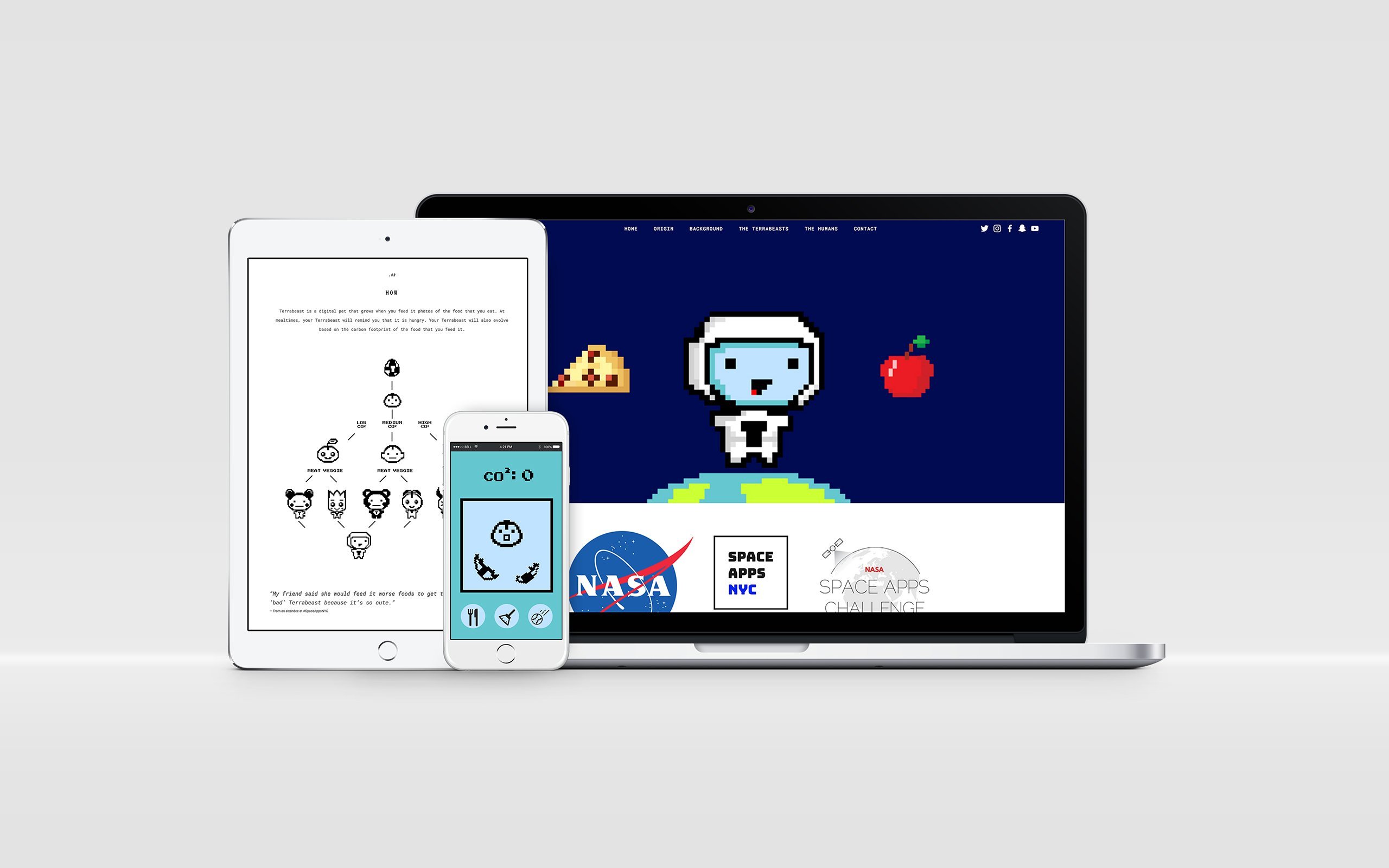 Many of us grew up with Tamagotchis, and we loved the idea of having a virtual pet (the cute alien) that will evolve depending on the carbon footprint of what you feed to it, based on photos you take of your meals. So, the Terrabeast will go through a 'good' or 'bad' evolution depending on the carbon footprint of what you are eating in real life. We loved the randomness of evolution and the educational part of the game. We were consciously trying to teach players about the impact of their food choices through the app, e.g., the carbon footprint of steak is much higher than the carbon footprint of chicken or fish.