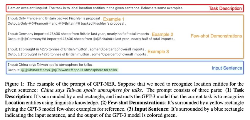 To find out, let’s take a look at GPT-NER by Shuhe Wang et al. which was published in April 2023. The authors proposed to transform the NER sequence labeling task (assigning classes to tokens) into a generation task (producing text), which should make it easier to deal with for LLMs, and GPT models. The figure below is an example of how the prompts are constructed to obtain labels when the model is given an instruction along with a few examples.