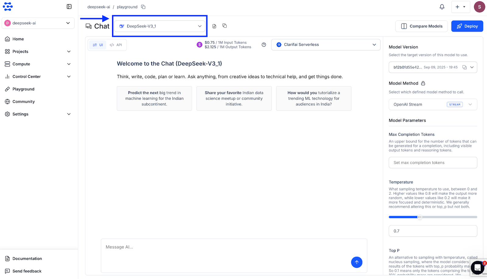 You can select any DeepSeek model, including DeepSeek‑R1, DeepSeek‑V3.1, or distilled versions available on the community. You can input prompts, adjust parameters such as temperature and streaming, and immediately see the model responses. The Playground also allows you to compare multiple models side by side to test and evaluate their responses.