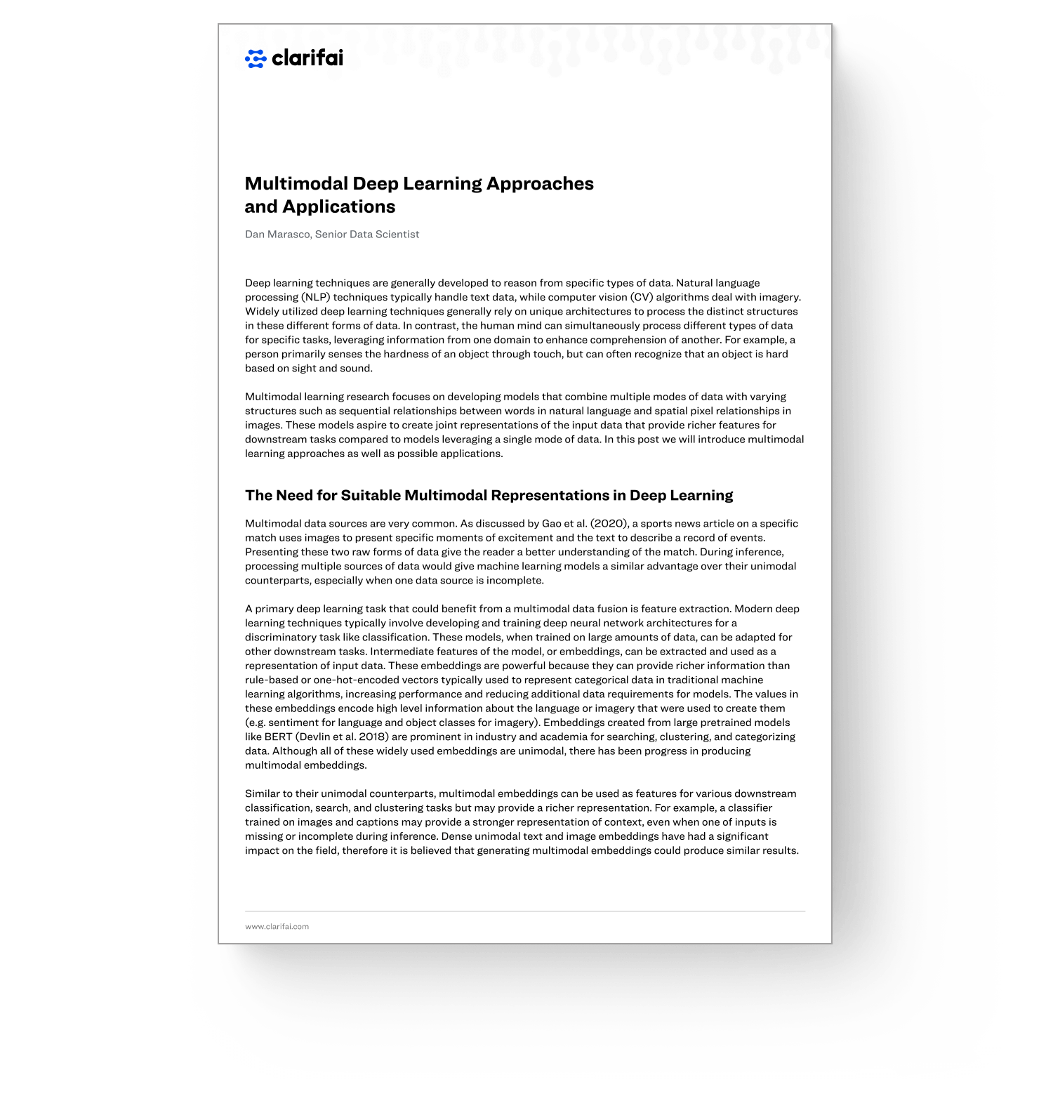 For example, a person primarily senses the hardness of an object through touch, but can often recognize that an object is hard based on sight and sound. Multimodal learning research focuses on developing models that combine multiple modes of data with varying structures such as sequential relationships between words in natural language and spatial pixel relationships in images. These models aspire to create joint representations of the input data that provide richer features for downstream tasks compared to models leveraging a single mode of data. In this post we will introduce multimodal learning approaches as well as possible applications.