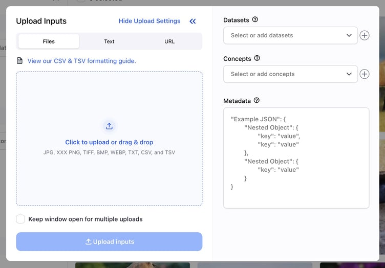 Experience the improved Input Uploader, a more powerful Input Manager with dataset input assignment, multimodal concept search and a unified UI for viewing your prediction & annotation results. Read more about uploading data.