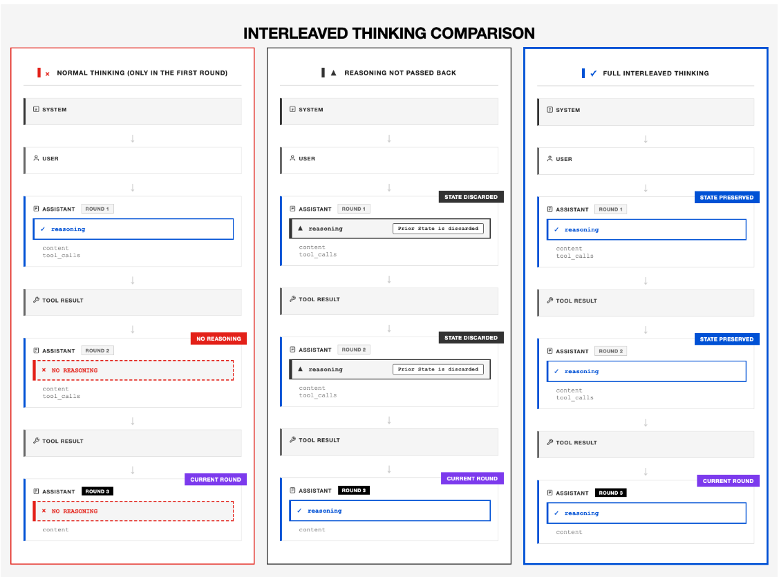 The model supports interleaved reasoning and action, allowing it to reason, call tools, and react to observations across extended agent loops. This makes it well-suited for tasks involving long sequences of actions, such as web navigation, multi-file coding, or structured research tasks.