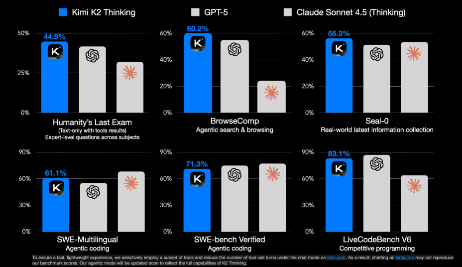 Overall, these results show Kimi K2 Thinking outperforming GPT-5 and Claude Sonnet 4.5 across reasoning, agentic, and coding evaluations.