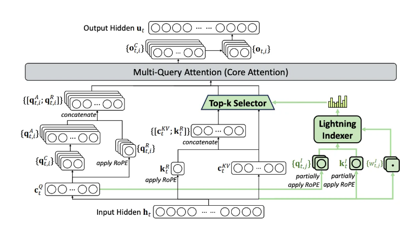 As shown in the below figure, the attention layer combines Multi-Query Attention, a Lightning Indexer, and a Top-K Selector. The indexer identifies relevant tokens, and attention is computed only over the selected subset, with RoPE applied for positional encoding.