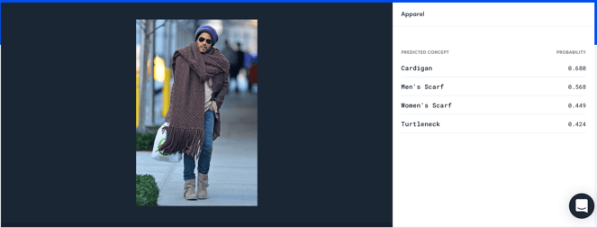 In this photo, the classification model focused on trying to identify the scarf, the largest item of clothing. But it is missing other pieces of the outfit.