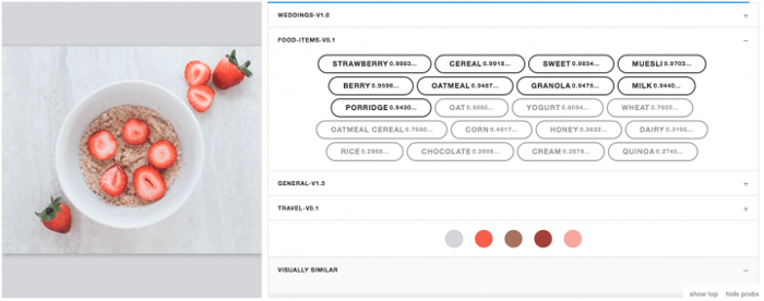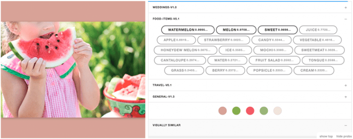 The Food Recognition model can be used alone or with any of our other visual recognition models to enhance food-related results. For example, you could use the Travel Recognition model we released last month with the Food Recognition model to categorize which foods are eaten where. And, remember our Not Safe for Work (NSFW) Nudity Recognition model? You could use the NSFW Recognition Model with the Food Recognition Model to find #foodporn in the most literal sense. You know, if you’re into that kind of thing.