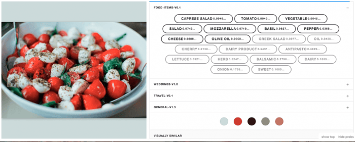 Not only is the Food Recognition model great for building diet, cooking, and recipe apps, it’s also perfect for businesses in the travel and hospitality industry! Restaurant review platforms like Yelp, Foursquare, OpenTable, Caviar, GrubHub, Seamless, etc. can use the Food Recognition model to categorize user-generated content automatically or manage a library of photos submitted by restaurants. The Food Recognition model can make media management much, much easier and help surface the right content to users!