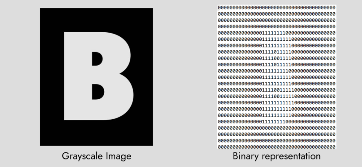 The image below shows a picture of the letter ‘B’ and its corresponding binary representation. The pixel values in this image display the light intensity of one or several spectral bands (gray or colored images).