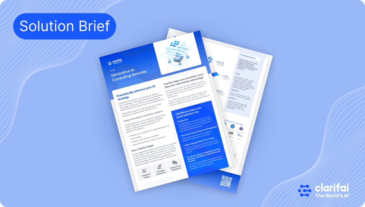 Together with our patented AI platform, Clarifai provides a solution including data preparation, model development, and operationalization so you build and deploy models at scale.
